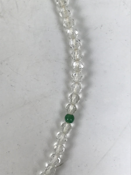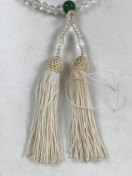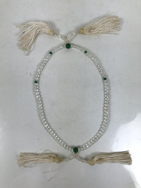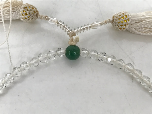 This is a vintage Japanese Buddhist prayer rosary bracelet, Juzu. It is made of small clear and green beads. The whole chain is held together by a white string going through two transparent main beads to which are attached two white tassels.