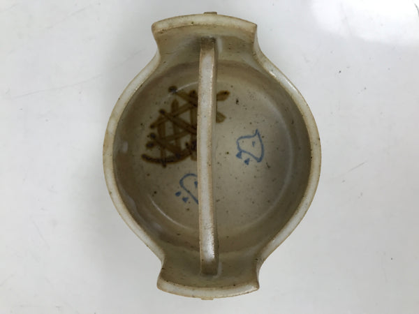 This vintage Japanese ceramic small bowl, also called kashiki or kashibachi, is beige with a foggy white glaze on top. It features brown leaves and a brown mesh, and blue chidori birds, or plovers, a popular traditional pattern. It is a basket-like shape, with a handle at the top. It is ideal to serve snacks or small food when hosting guests or parties.