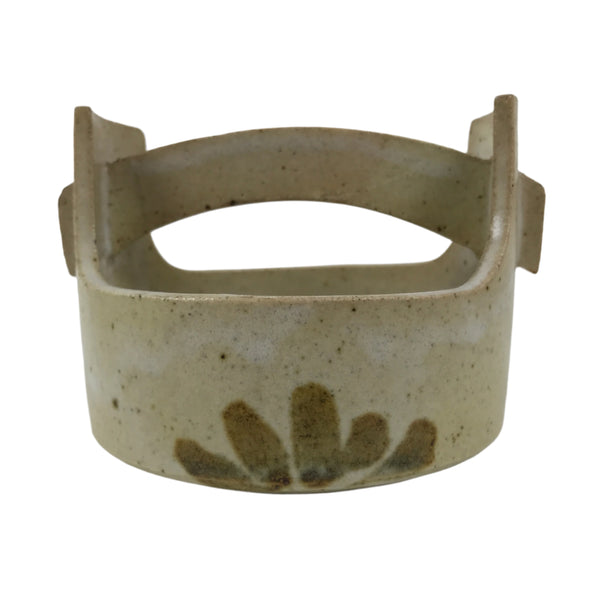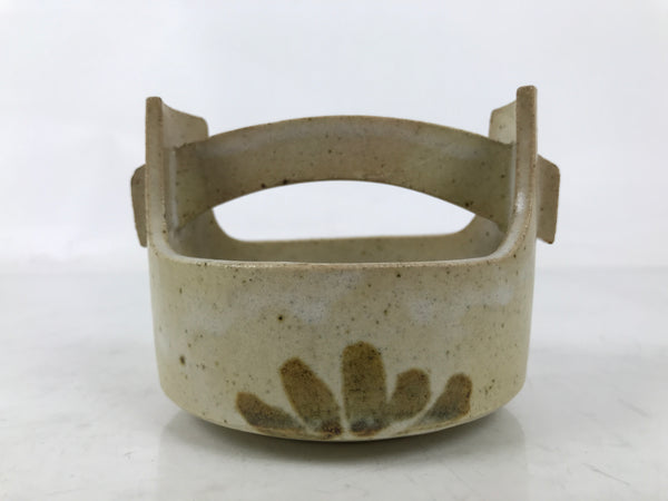 This vintage Japanese ceramic small bowl, also called kashiki or kashibachi, is beige with a foggy white glaze on top. It features brown leaves and a brown mesh, and blue chidori birds, or plovers, a popular traditional pattern. It is a basket-like shape, with a handle at the top. It is ideal to serve snacks or small food when hosting guests or parties.