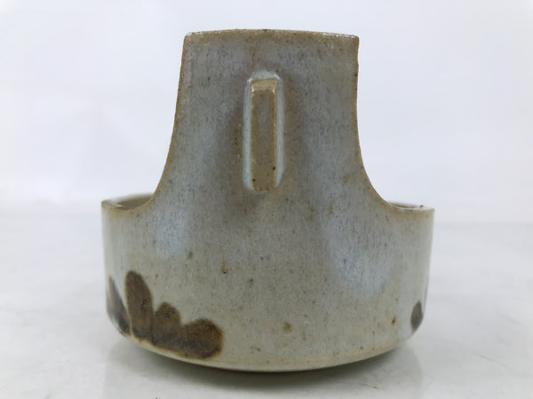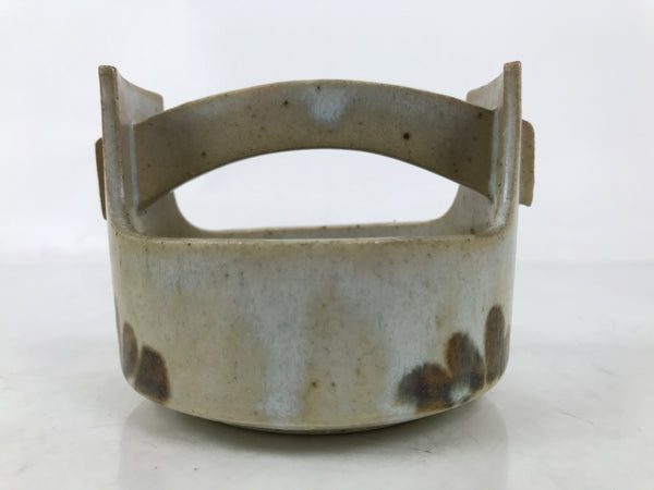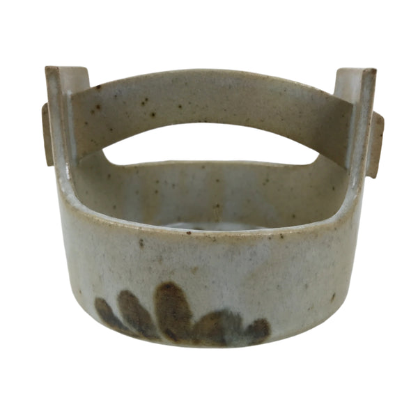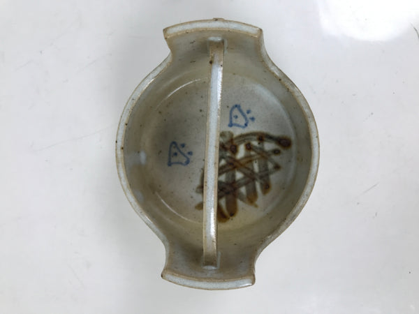 This vintage Japanese ceramic small bowl, also called kashiki or kashibachi, is gray with a foggy white glaze on top. It features brown leaves and a brown mesh, and blue chidori birds, or plovers, a popular traditional pattern. It is a basket-like shape, with a handle at the top. It is ideal to serve snacks or small food when hosting guests or parties.