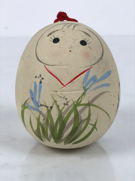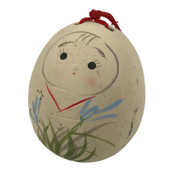 This is a vintage Japanese clay bell, Dorei or Tsuchi-Suzu. It is in the shape of a hime daruma, a type of alternative style daruma that features a young girl, usually with a kimono and a sweet face. This particular one is a beige color with black eyes and a blue and green floral design at the bottom covering the kimono. There is a red string attached to the top, and there is a white clay ball inside.