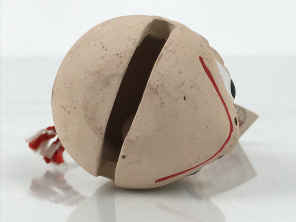 This is a vintage Japanese clay bell, or dorei. It is in the shape of a cute kappa face, a folklore creature that is said to live in rivers. It is mostly a light tan color. It has a small white clay ball inside and has a red and white cord tied at the top via a loop. There is a small paper tag that says "Beware of Fire". The back side says "Fire prevention" and "Ward off disaster". This dorei is an amulet.