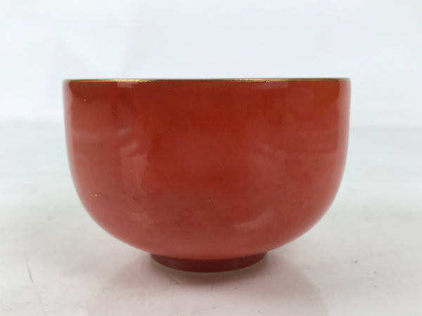 This is a Japanese vintage porcelain tea cup (Yunomi). It is red-orange on the outside and white on the inside. There is a thin gold foil line on the rim. It is a very simple design with a beautiful color. This cup is for serving sencha (steeped loose leaf tea).