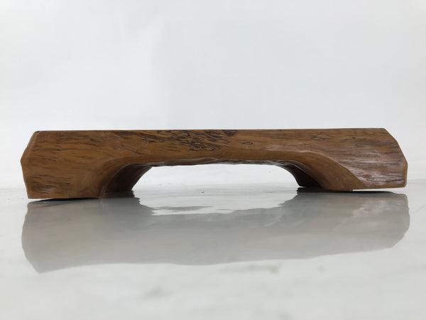 Used for the display of flower vases, ikebana arrangements, bonsai, and more, this classic, uniquely shaped kadai is one-of-a-kind, handcrafted from a piece of solid wood (cross-section of a tree trunk). It is stained a medium brown with a clear brushed lacquer coating. The stand has many different grooves and textures on all sides to create visual interest from any angle and stands on four short legs for stability with a tapered rectangular shape.