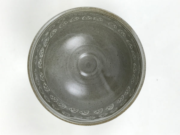 This is a vintage Japanese ceramic green tea bowl or matcha chawan. It is gray with white patterns, carved and inlaid. This piece is in the Mishima style. An engraved sign is around the foot.