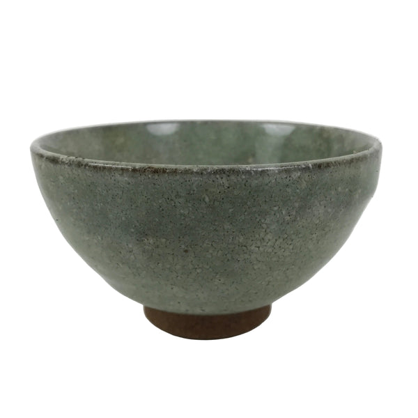 This is a vintage Japanese ceramic green tea bowl or matcha chawan. It is gray-green with some different tones. The glaze has a fine crackle throughout, which breaks up the color and gives it a stone-like, misty appearance.