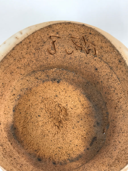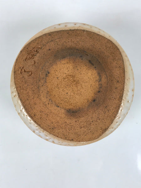 This is a vintage Japanese ceramic green tea bowl or matcha chawan. This piece is a perfect example of classic shino style, a white pocked glaze, orangish-brown accents, and a rich terracotta-brown base. There is a signature around the foot. It is sturdy and easy to handle.