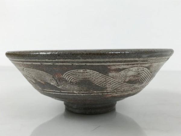 This is a vintage Japanese ceramic green tea bowl, or matcha chawan. It is in the Mishima ware style. This gray bowl features carved and inlaid white patterns, floral inside, and waves outside. It has brown tones that appear to be a clay base visible through the glaze or a kiln effect during firing. It has a signature around the foot.