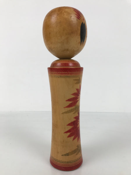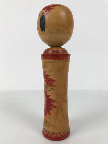 This vintage Japanese wooden kokeshi doll has a classic design (round head, cylindrical body). The body has a slight curve and is painted with red chrysanthemums. The facial expression is young and mischievous, and it is surrounded by tufts of black painted hair and extra red details to match the body. It has been brushed with a clear lacquer coating to give it shine.