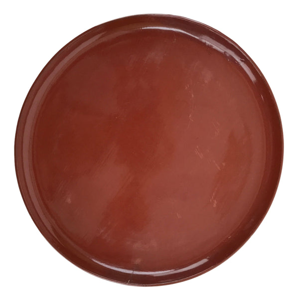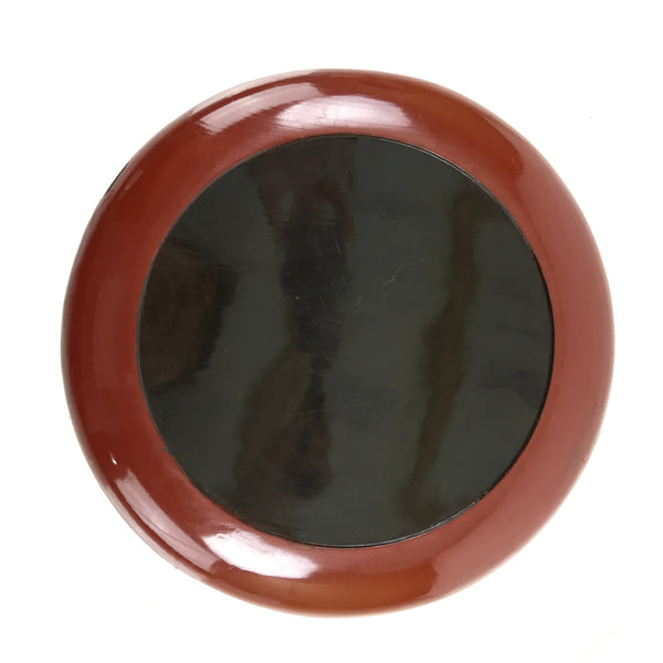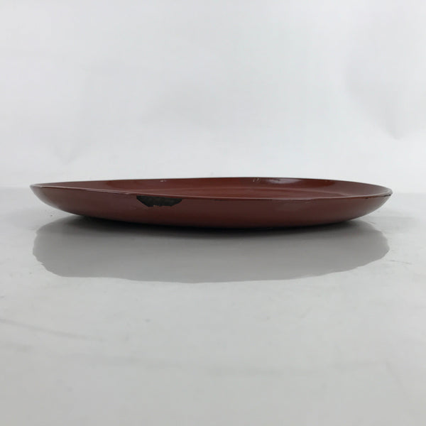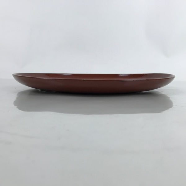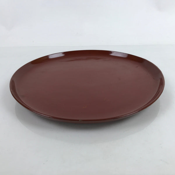 Mainly lacquered with a rich brown color on the top and black on the bottom, this vintage brushed lacquer Japanese serving tray is made of wood. It is round with slightly raised sides so drinks cannot easily slide off. It a simple design with no added embellishments.