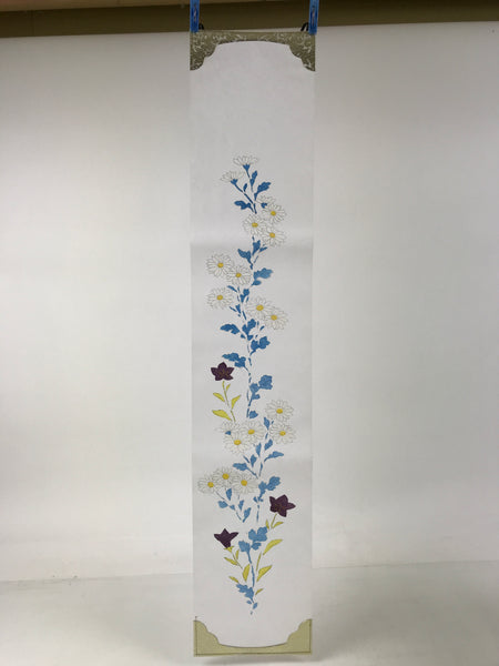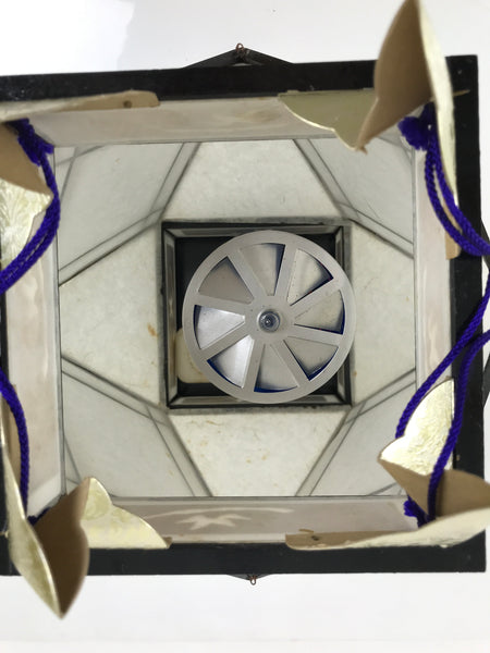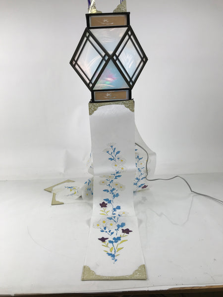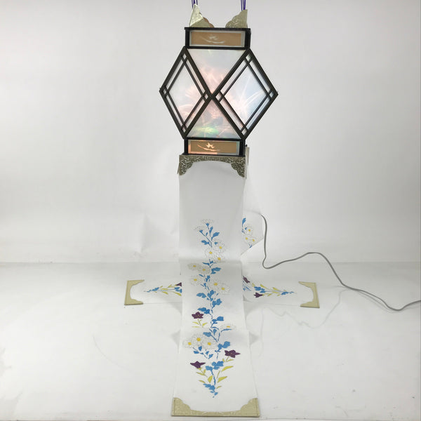 This is a vintage Japanese paper hanging electric lantern called chochin. This particular lantern is displayed during the summer obon festival. It is made with white washi paper with a wooden black frame. At the bottom, there are pieces of washi paper decorated with a floral pattern with kikyo bell flowers and chrysanthemum flowers. It lights up and projects a colorful floral pattern. This lantern comes in the original paper box with instructions in Japanese.