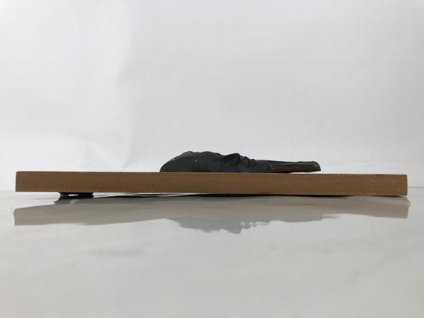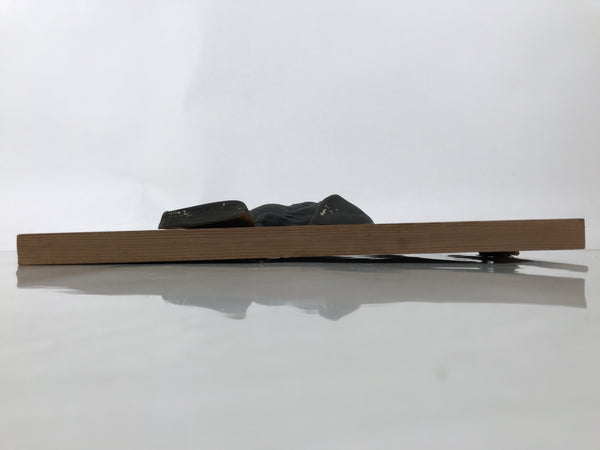 This vintage Japanese piece of wall hanging art features the face of a man. The mask is painted in black and attached by a wire to a solid wood panel. There are some characters on the top right. There is a string meant for hanging at the top. This piece is signed on the back.