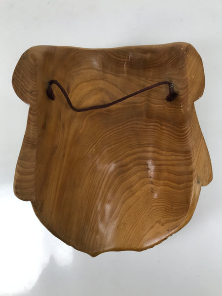 This is a vintage Japanese carved wooden mask (omen) of Ebisu, one of the Seven Lucky Gods. It is a medium brown color with a brushed clear lacquer finish. There is a purple braided cord stapled to the back for easy hanging.