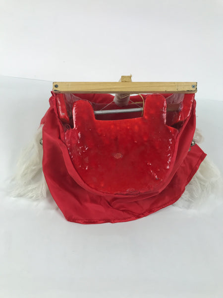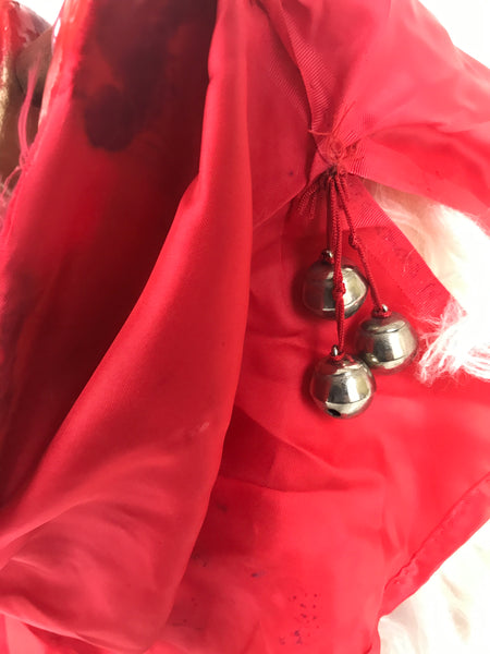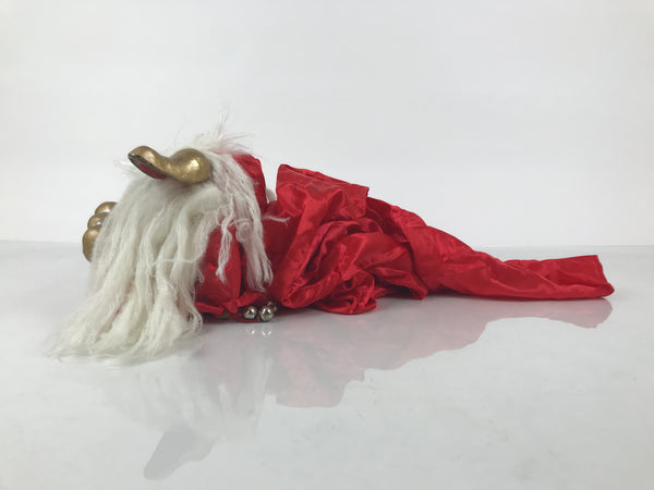 This is a Japanese lacquered wooden shishi lion mask. Also called komainu, these lion dogs are often depicted as guardian statues outside of temples. They are also famous for shishi-mai, or lion dance (which has a Chinese equivalent). This gorgeous piece can be used for room decoration or shows and dances. The mouth opens and closes on a wooden frame and hinge attached to a string, and the ears are adjustable/removable. It has a long red silk fabric panel covering the back side. There are clusters of bells attached to either side of the back of the head. It comes in a paper box.