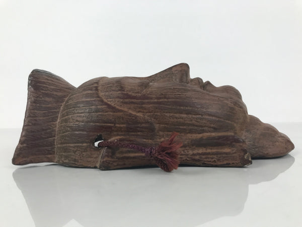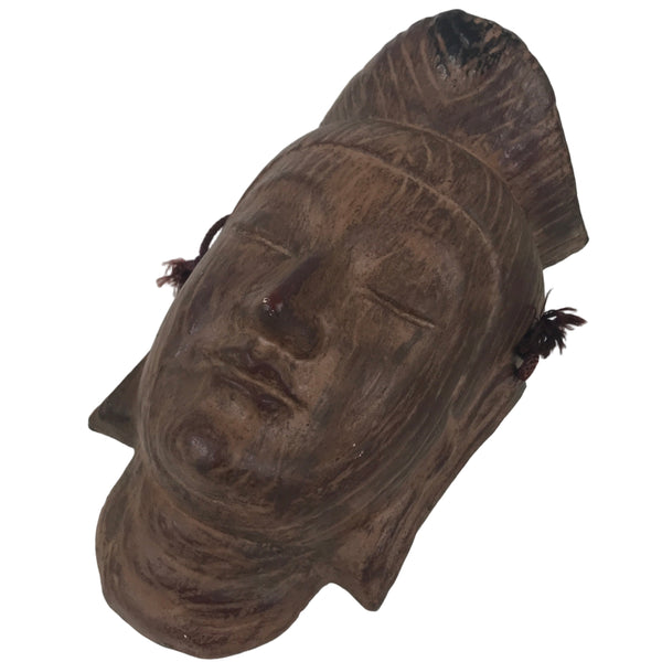 This is a vintage Japanese plaster Buddhist mask that depicts the calm face of the Maitreya Bodhisattva (also known as Kannon or Mirokubosatsu). It is crafted to look as if it were carved from wood and has a brown string attached for easy wall hanging.