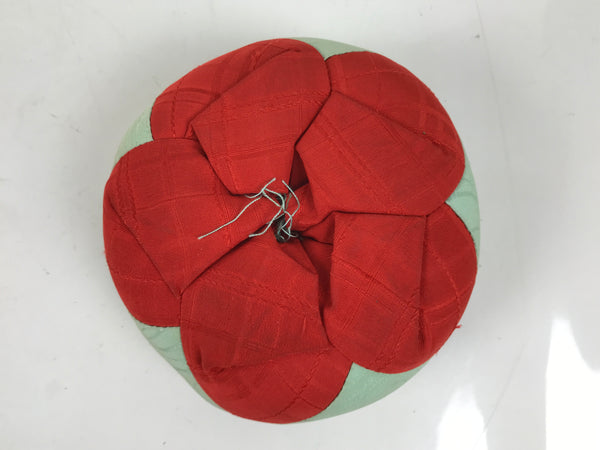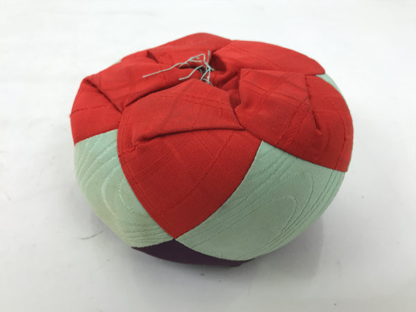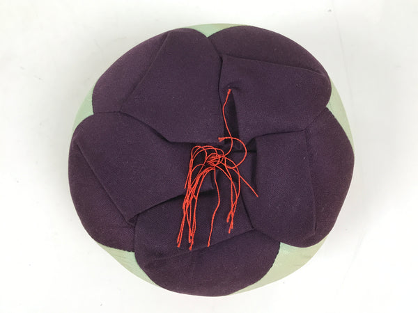 This is a vintage Japanese orin bell for Buddhist altars. It contains a bronze metal bowl with a dark brown wooden striker. It rests on a red, grayish blue, and purple silk pillow with red and blue tassels, as well as on a hexagonal black and gold lacquered resin stand.