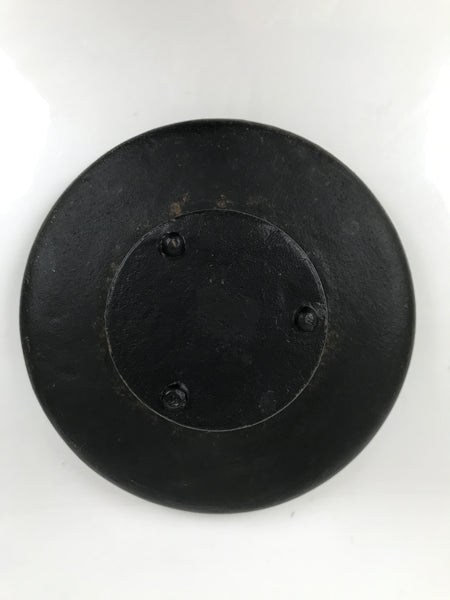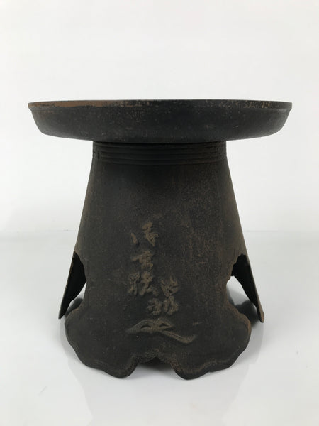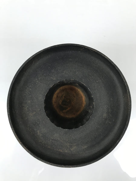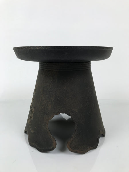 This is a usubata flower vase for ikebana flower arrangements, made of iron, in the Ikenobo style. It consists of two pieces: a bottom stand and a removable flat saucer-shaped top. There are inscriptions of Ikenobo and the name of this type of vase, Ogencho, on the body. This unique vase will surely become a statement piece in any room.