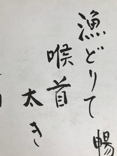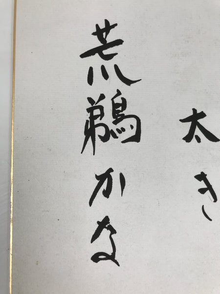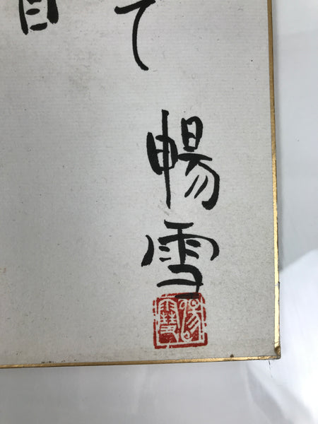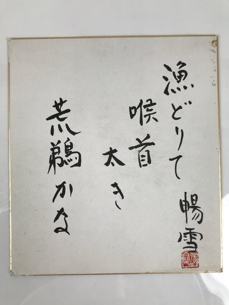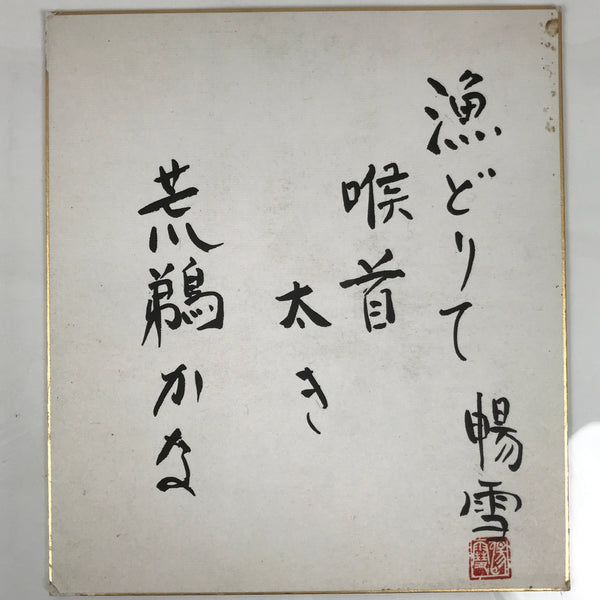 This vintage Japanese shikishi art board features calligraphy of a poem about cormorant fishing. It is hand-written in black character. This shikishi is signed with a name and a red seal.