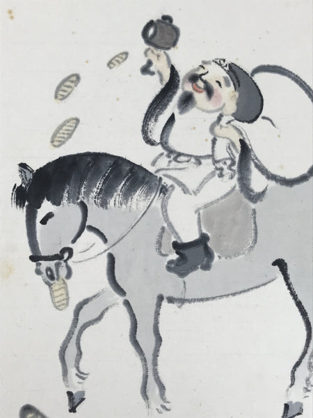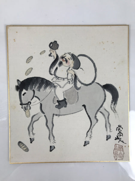 This item is a Japanese shikishi art board representing Daikokuten, one of the Seven Lucky Gods, riding a horse. Daikokuten is smiling, carrying a big sack on his back and holding a lucky mallet (Uchide no kozuchi) in his hand. It is painted in black, white, and gray, with some dashes of color.