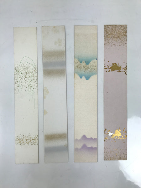 This is a vintage set of blank Japanese tanzaku long-type shikishi art boards. They are commonly used for writing seasonal messages and wishes, haiku, and Buddhist themes. This set of four is a combination of blue, purple, and a hint of green with gold-fleck accents. These are much thinner than typical shikishi. Tanzaku are often displayed in narrow wooden frames to hang on the wall.