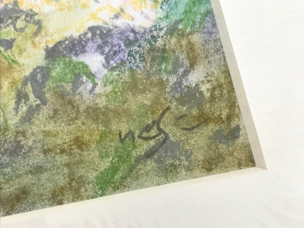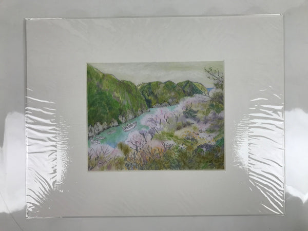 This original pastel drawing on cardstock paper features a scene during peak cherry blossom flowering season along a river leading out to sea. Pastel is a gorgeous, often overlooked, art medium that blends colors together beautifully and this piece is no exception. It is adhered to a plain white matboard, ready for easy framing and is stored in a plastic sleeve. This work is signed by the Japanese artist Yoshihiro Hagino.