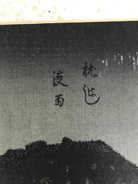 This Japanese ukiyo-e is a woodblock print by Utagawa Hiroshige II titled 'Rainy Night at Makurabashi'. It represents two men walking on a bridge on a rainy night. The title is written at the top, and it is signed. This piece is an authentic woodblock print, but it is a reprint from the Showa period, not a first edition. The print is placed on a piece of cardboard.