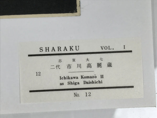 This Japanese ukiyo-e is a woodblock print by Toshusai Sharaku featuring a kabuki actor in character. The character is a man in black kimono holding a Japanese sword. This piece is titled 'Ichikawa Komazo II as Shiga Daishichi'. The print is placed on a thick paper that folds in two with an opening on the top. There is a label with explanations in English on the inside. This piece is an authentic woodblock print, but it is a reprint, not a first edition.