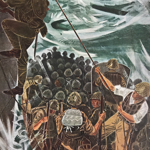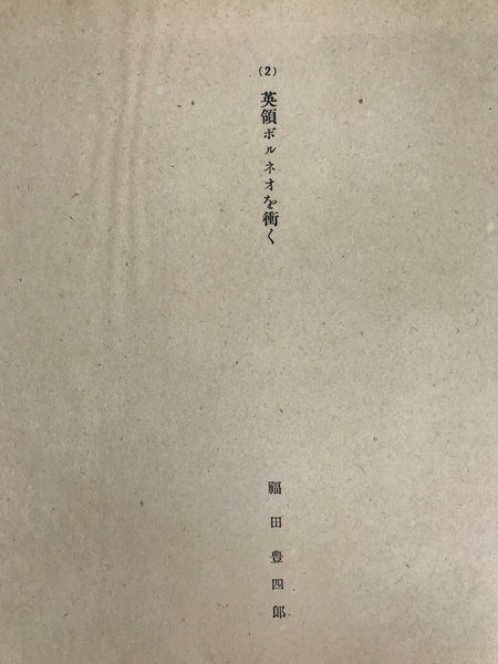 This is a vintage Japanese machine-printed reproduction of a military drawing by Fukuda Toyoshiro. The piece is called 'Hitting British Borneo'. The Battle of Borneo took place between 1941 and 1942. The piece is placed on a piece of cardboard with a protective sheet of paper on top, with the title and the name of the painter.