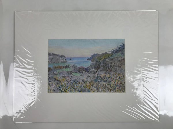 This original pastel drawing on cardstock paper features a scenic view of the sea from a rocky stretch of coastline in a winter color scheme. Pastel is a gorgeous, often overlooked, art medium that blends colors together beautifully and this piece is no exception. It is adhered to a plain white matboard, ready for easy framing and is stored in a plastic sleeve. This work is signed by the Japanese artist Yoshihiro Hagino.