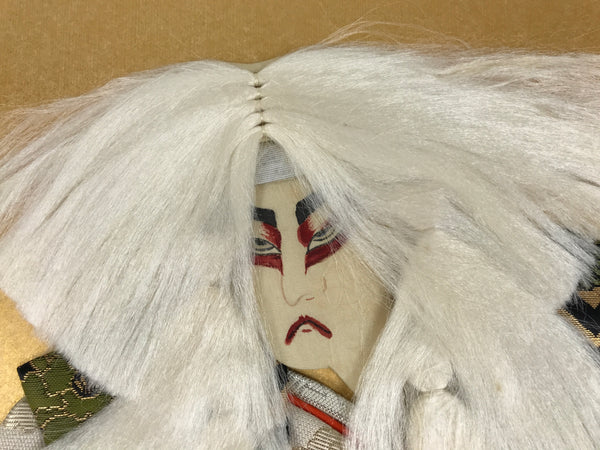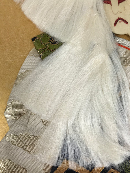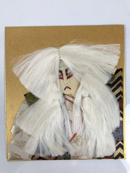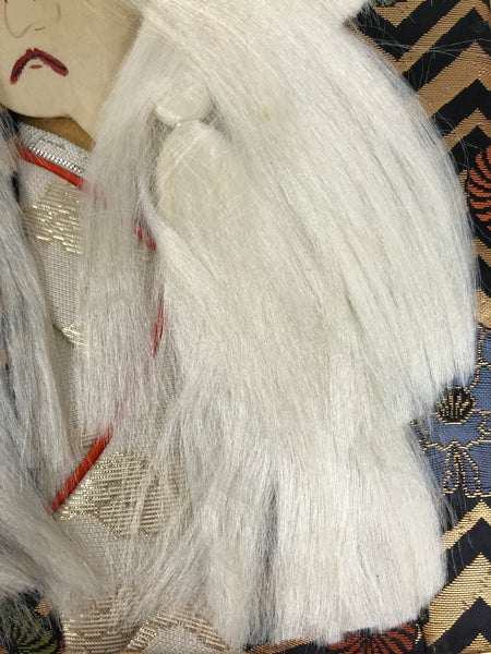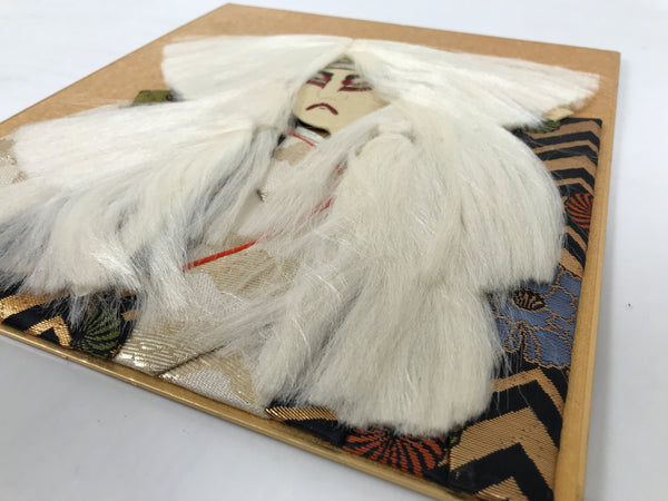 This vintage Japanese shikishi art board features an oshie-zaiku (Japanese patchwork) design of the white lion from the famous Kabuki dance Renjishi. This particular dance represents the power struggle between a father and son, the white lion as the aging father and the red lion as the strong son. Oshie-zaiku gives a unique 3D appearance, and different textures and patterns of silk fabric, and the addition of hair and other materials adds extra dimension.