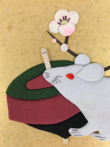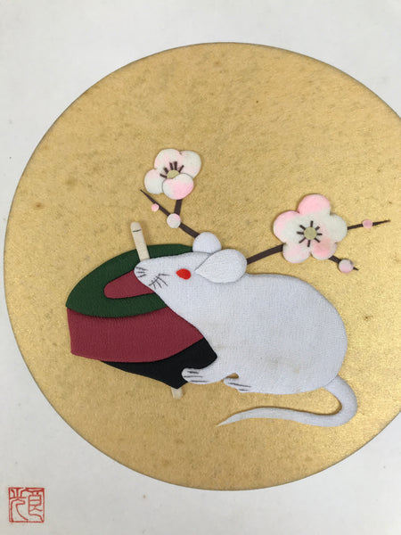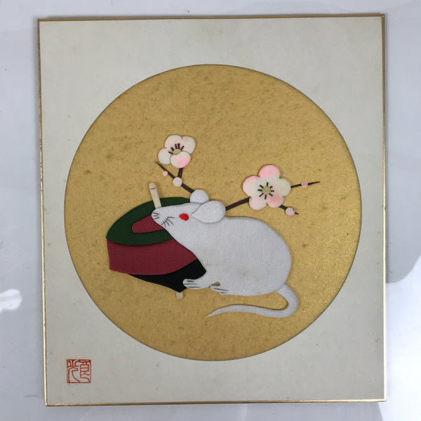 This vintage Japanese shikishi art board features an oshie-zaiku (Japanese patchwork) design of a small white mouse in front of a spinning top (popular traditional toy). In the background are pink plum blossoms. This mouse represents the zodiac and during its year would have been featured on numerous decorative fixtures such as small figurines and artwork. Oshie-zaiku gives a unique 3D appearance, and different textures and patterns of silk fabric add extra dimension.