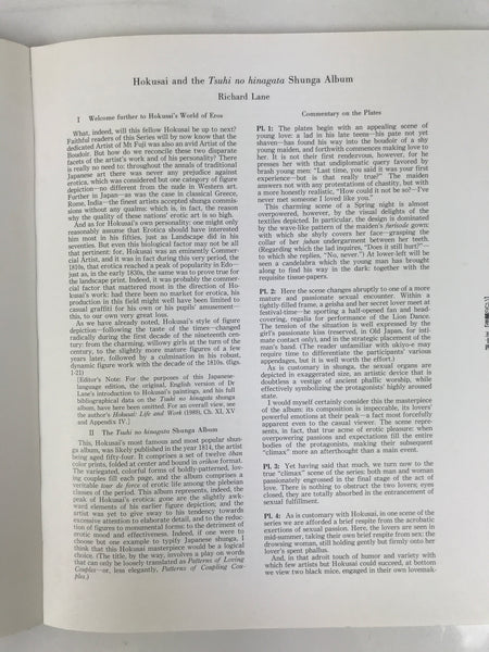This is a Japanese art information book of erotic shunga woodblock prints by Hokusai. The Shunga reproductions in this book are from an antique Japanese Edo period art book of erotic shunga woodblock prints titled Tsui no hinagata. The shunga depict love scenes of ordinary people in the Edo era. The shunga also shows the dialogue between the couple at the scene. This book has an English explanation at the end.