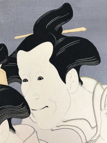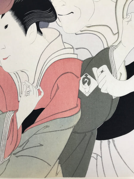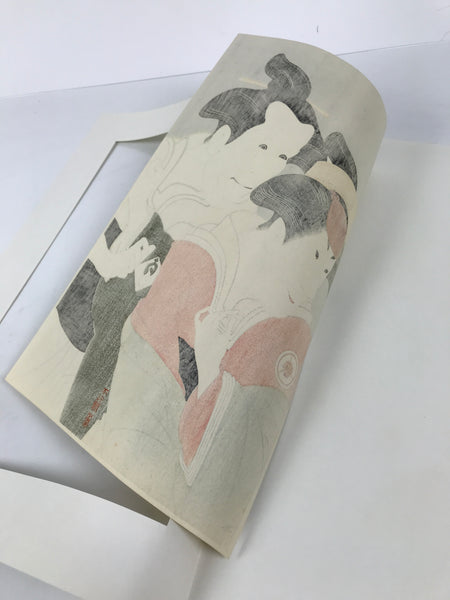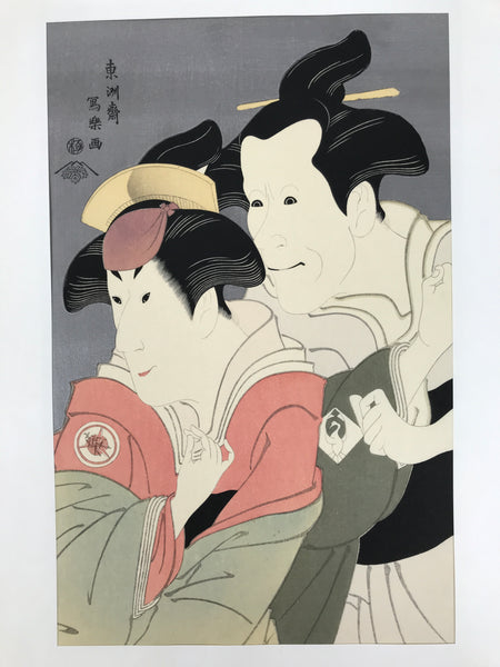 This Japanese ukiyo-e is a woodblock print by Toshusai Sharaku featuring two kabuki actors in character. The characters are women. This piece is titled 'Bando Zenji as Ozasa, the Wife of Washizuka Kandayu; Iwai Kiyotaro as Fujinami, the Wife of Sagisaka Sanai'. The print is placed on a thick paper that folds in two with an opening on the top. There is a label with explanations in English on the inside. This piece is an authentic woodblock print, but it is a reprint, not a first edition.