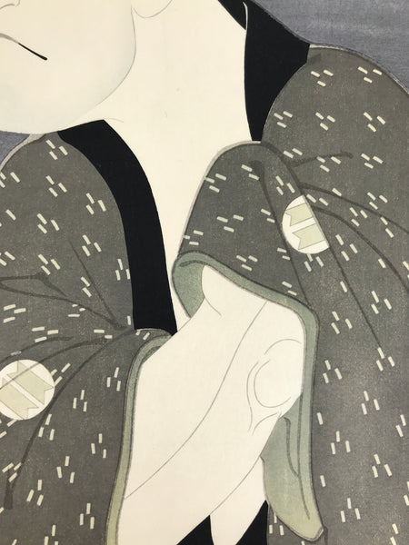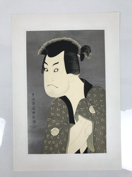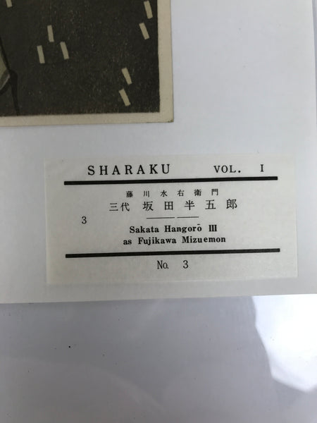 This Japanese ukiyo-e is a woodblock print by Toshusai Sharaku featuring a kabuki actor in character. The character is a man wearing a gray kimono. This piece is titled 'Sakata Hangoro III as Fujikawa Mizuemon'. The print is placed on a thick paper that folds in two with an opening on the top. There is a label with explanations in English on the inside. This piece is an authentic woodblock print, but it is a reprint, not a first edition.