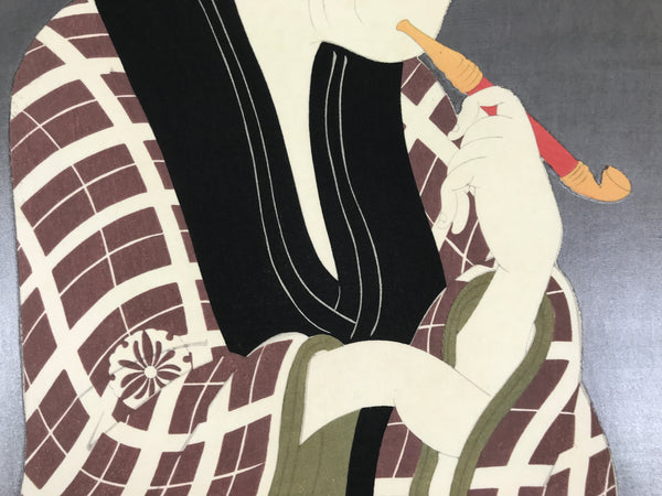 This Japanese ukiyo-e is a woodblock print by Toshusai Sharaku featuring a kabuki actor in character. The character is a man wearing a white and brown kimono with a geometric pattern. He is smoking a kiseru pipe. This piece is titled 'Matsumoto Koshiro IV as Fishmonger Gorobei of Sanya'. The print is placed on a thick paper that folds in two with an opening on the top. There is a label with explanations in English on the inside. This piece is an authentic woodblock print, but it is a reprint, not a first edition.