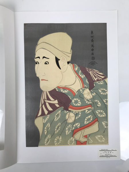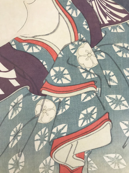 This Japanese ukiyo-e is a woodblock print by Toshusai Sharaku featuring a kabuki actor in character. The character is a man wearing a light blue and white kimono with geometrical patterns. This piece is titled 'Morita Kanya IX as Uguisu no Jirosaku, a palanquin bearer'. The print is placed on a thick paper that folds in two with an opening on the top. There is a label with explanations in English on the inside. This piece is an authentic woodblock print, but it is a reprint, not a first edition.