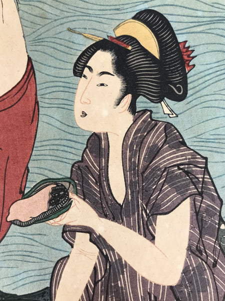 This Japanese ukiyo-e is a woodblock print by Kitagawa Utamaro. It is the centerpiece of a three-part work called 'Abalone shell divers' or 'Pearl divers'. This piece represents two women on a rock next to the sea. One woman has just got out of the water, and the other one is next to a basket full of abalone shells, or awabi in Japanese. This piece is an authentic woodblock print, but it is a reprint from the Showa period, not a first edition. The print is placed on a piece of cardboard.