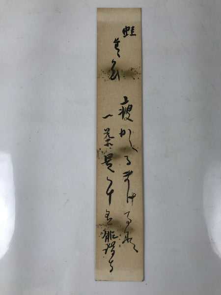 This is a vintage Japanese wooden wall hanging frame, Tanzaku-kake, with a Tanzaku. A Tanzaku is a long and narrow Shikishi used for painting and writing Japanese poems such as Haiku or Tanka. The Tanzaku is accented with gold and silver sprinkles and a foggy gold color.  A Japanese poem, Haiku, is written on the Tanzaku and the poem is by the famous Japanese poet Kobayashi Issa. Brown floral fabrics are used to fix the Tanzaku.