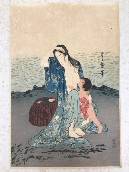 This Japanese ukiyo-e is a woodblock print by Kitagawa Utamaro. It is the centerpiece of a three-part work called 'Abalone shell divers' or 'Pearl divers'. This piece depicts a woman by the sea, near a basket filled with shells, likely abalone shells, and seaweed. The woman is breastfeeding a child. This piece is an authentic woodblock print, but it is a reprint from the Showa period, not a first edition. The print is placed on a piece of cardboard.