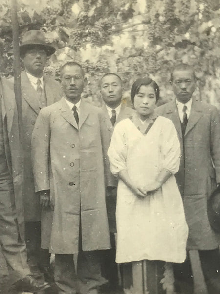 This is an original vintage early Showa Era photograph of a group of men in suits with one woman in kimono posing beneath a pergola with full-bloom wisteria flowers.
