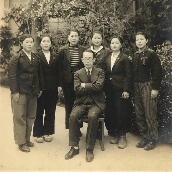 This is an original vintage Showa Era black and white photograph of a class of high school girls posing with their principal. They all wear some manner of trousers and a jacket which was popular post-WWII.