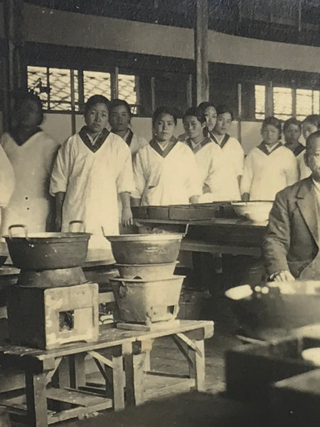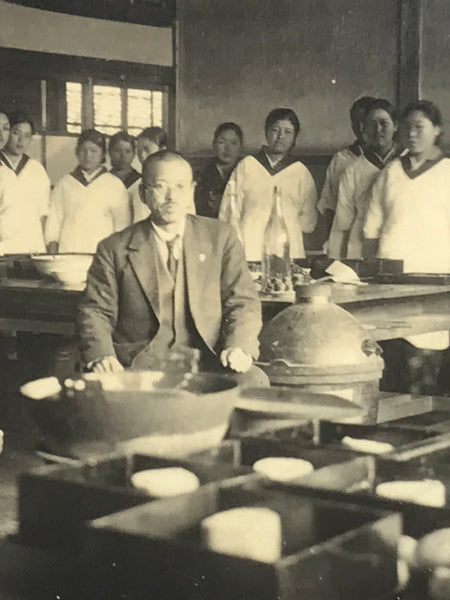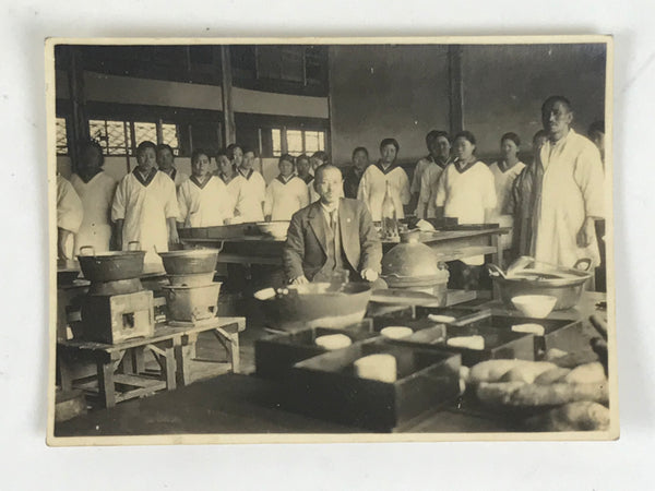 This is an original vintage Showa sepia tone photograph of a group of mostly women in kimono and aprons posing in a spacious industrial kitchen likely used for food service. It is also possible that this is a cooking school. The man on the right appears to be the head chef, while the suited man at the center is likely the owner of the business.