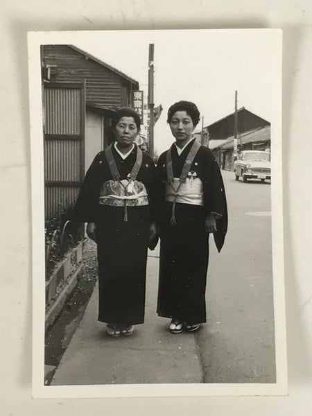 This is a Japanese vintage black and white photograph of two women (likely family) standing on a street in a neighborhood. They wear kimono and wagesa Buddhist sashes.
