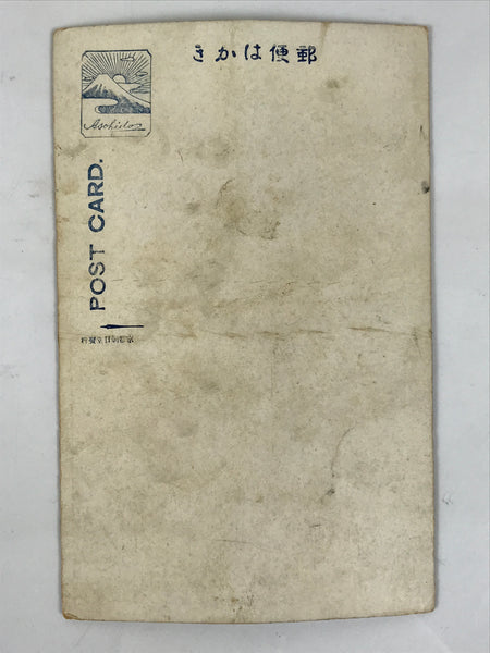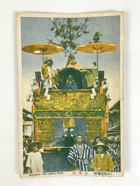 This vintage Japanese colorized postcard features a photograph of a matsuri float from the Kyoto Gion Festival. This particular float (or dashi in Japanese) is called Gyojayama. Three mechanized puppets are visible at the top of the float. People are posing in front of it.