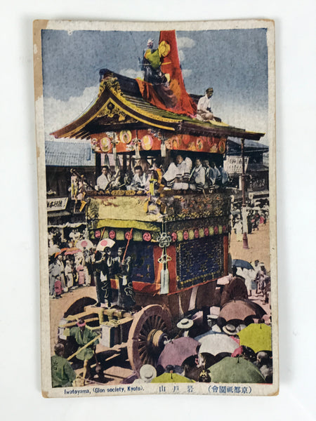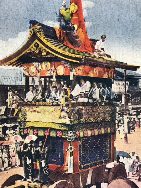 This vintage Japanese colorized postcard features a photograph of a matsuri float from the Kyoto Gion Festival. This particular float (or dashi in Japanese) is called Iwatoyama. Musicians are riding the float. People are gathered to watch the float.
