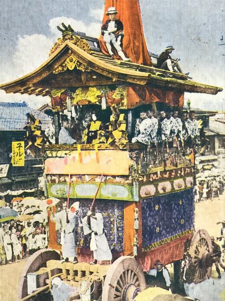 This vintage Japanese colorized postcard features a photograph of a matsuri float from the Kyoto Gion Festival. This particular float (or dashi in Japanese) is called Niwatorihoko. Musicians are riding the float, and a puppet is at the front.