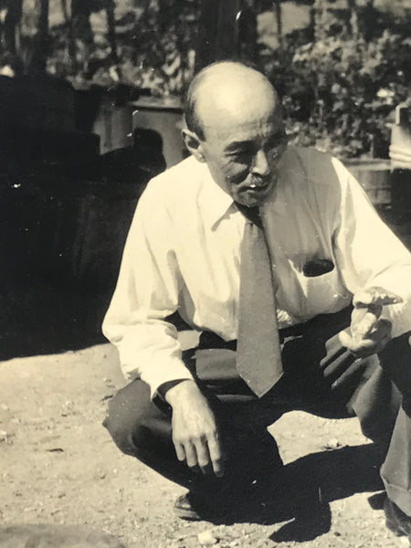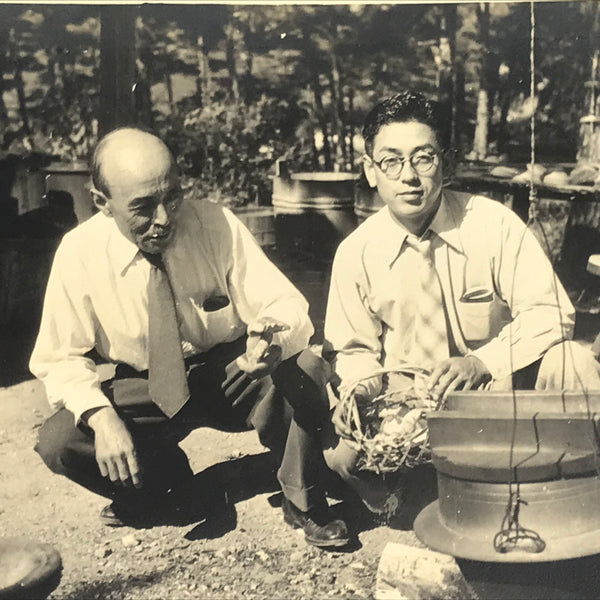 This is a Japanese vintage sepia tone photograph of two members of a company crouching near a fire pit with a traditional iron rice cooking pot (kama). The back of the photo says this is some manner of company picnic/celebration.