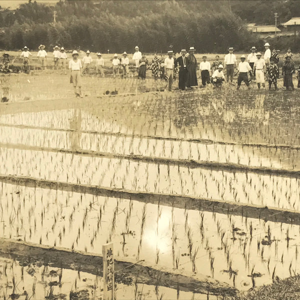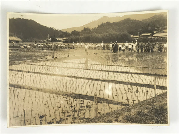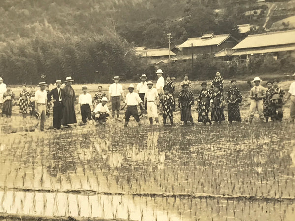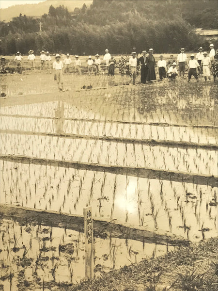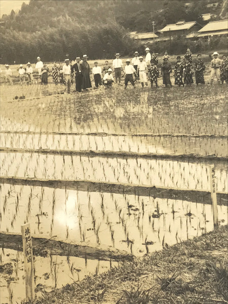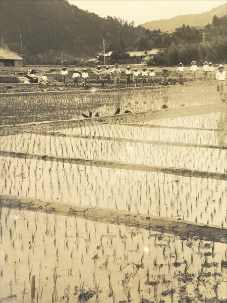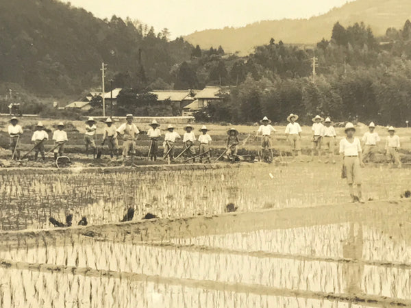 This is an original vintage early Showa Era daily life photograph of a group of school children of varying ages participating in rice planting. The students wear a combination of light kimono/yukata and short pants working clothes with hats.  Even in modern Japan, tasks such as gardening, cleaning, crafting, etc are skills that are taught to students at most levels of schooling whether for a dedicated class for life skills or, for example, the practical study of science. Elementary school students in rural areas still practice rice planting as a community activity even today!