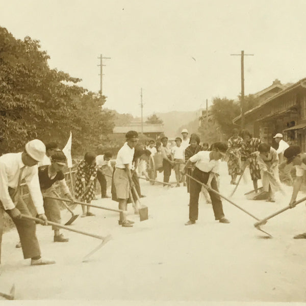 This is a vintage Japanese sepia-tone Showa-era photograph of people coming together to clean and repair roads in a small town. Roads were not paved, so perhaps once a year, communities would use hoes and rakes to remove stones and repair holes and uneven ground (the men), and the women and children would assist by sweeping up any debris into open-sided baskets. Some neighborhoods today still gather once or twice a year and do tasks such as pulling weeds and cutting grass.