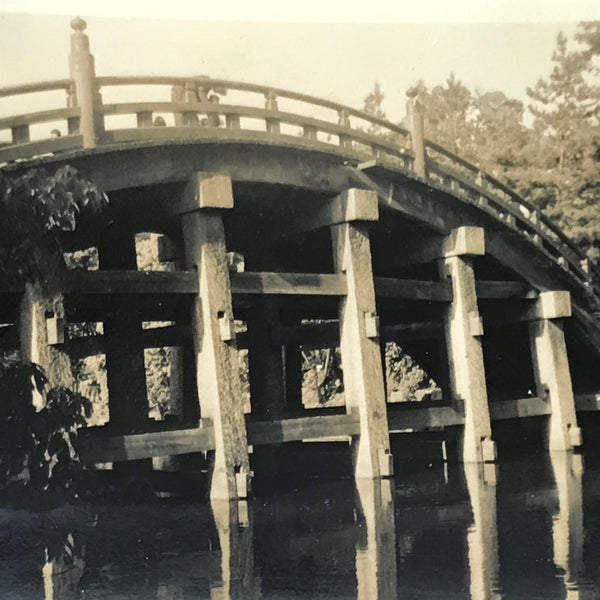 This is a Japanese vintage sepia tone photograph of the iconic Taiko Bridge (arched bridge taikobashi) found at Sumiyoshi Taisha, a Shinto shrine in Osaka. The base of the bridge is a natural wood color while the railing is red. This bridge is still a landmark to this day.